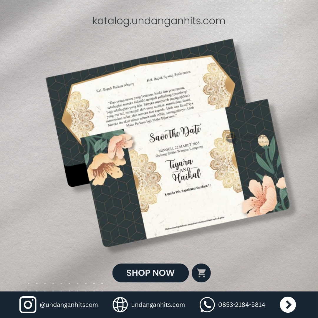 Undangan ini menampilkan desain modern dengan sentuhan elegan, dihiasi dengan bunga peony yang cantik dan detail ornamen lace yang menawan.