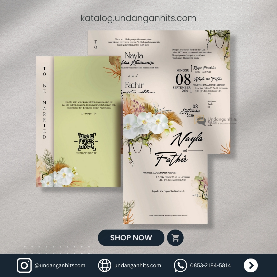 Undangan ini menampilkan keanggunan dengan sentuhan natural bunga anggrek dan warna pastel yang menawan. Desainnya sederhana namun tetap menarik dan elegan.