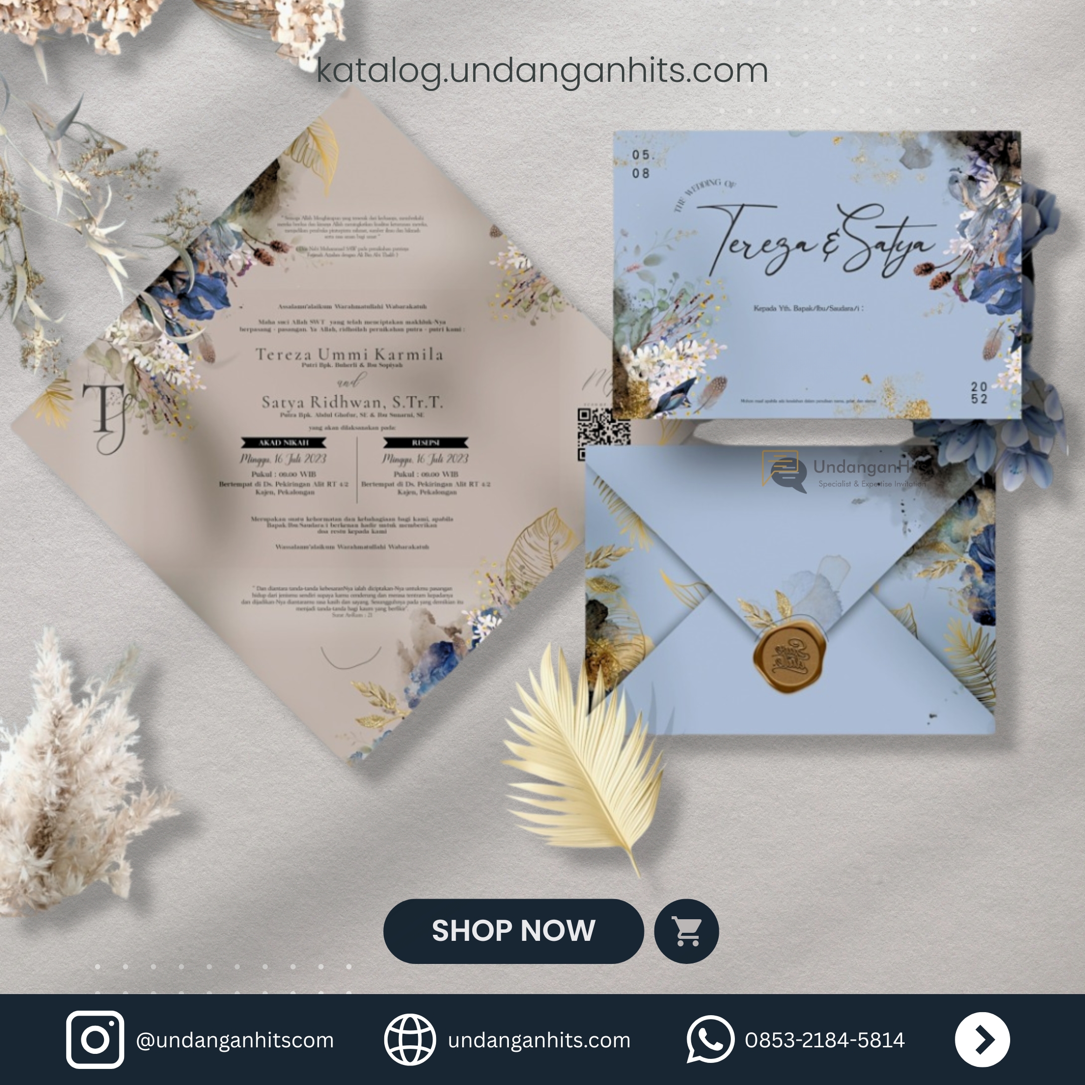 Undangan ini menampilkan keseimbangan sempurna antara elemen botani dan kemewahan dengan sentuhan daun kering dan aksen emas yang elegan.