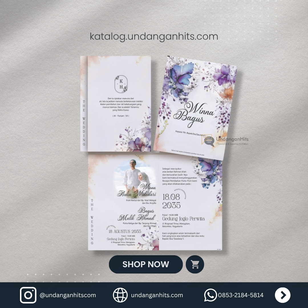 Undangan dengan nuansa bunga ungu dan aksen watercolor yang lembut, memberikan kesan elegan dan penuh keindahan.