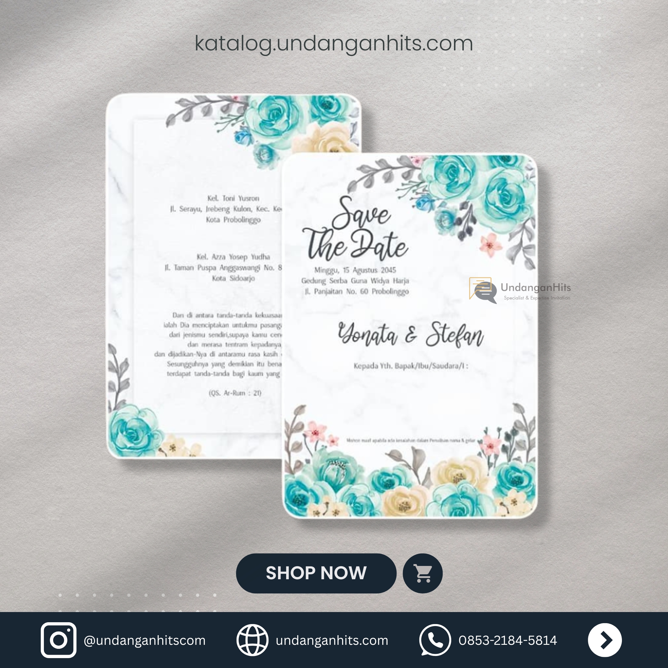 Undangan ini menampilkan sentuhan elegan dengan ornamen floral yang memikat, menciptakan suasana segar dan romantis untuk pernikahan Anda.