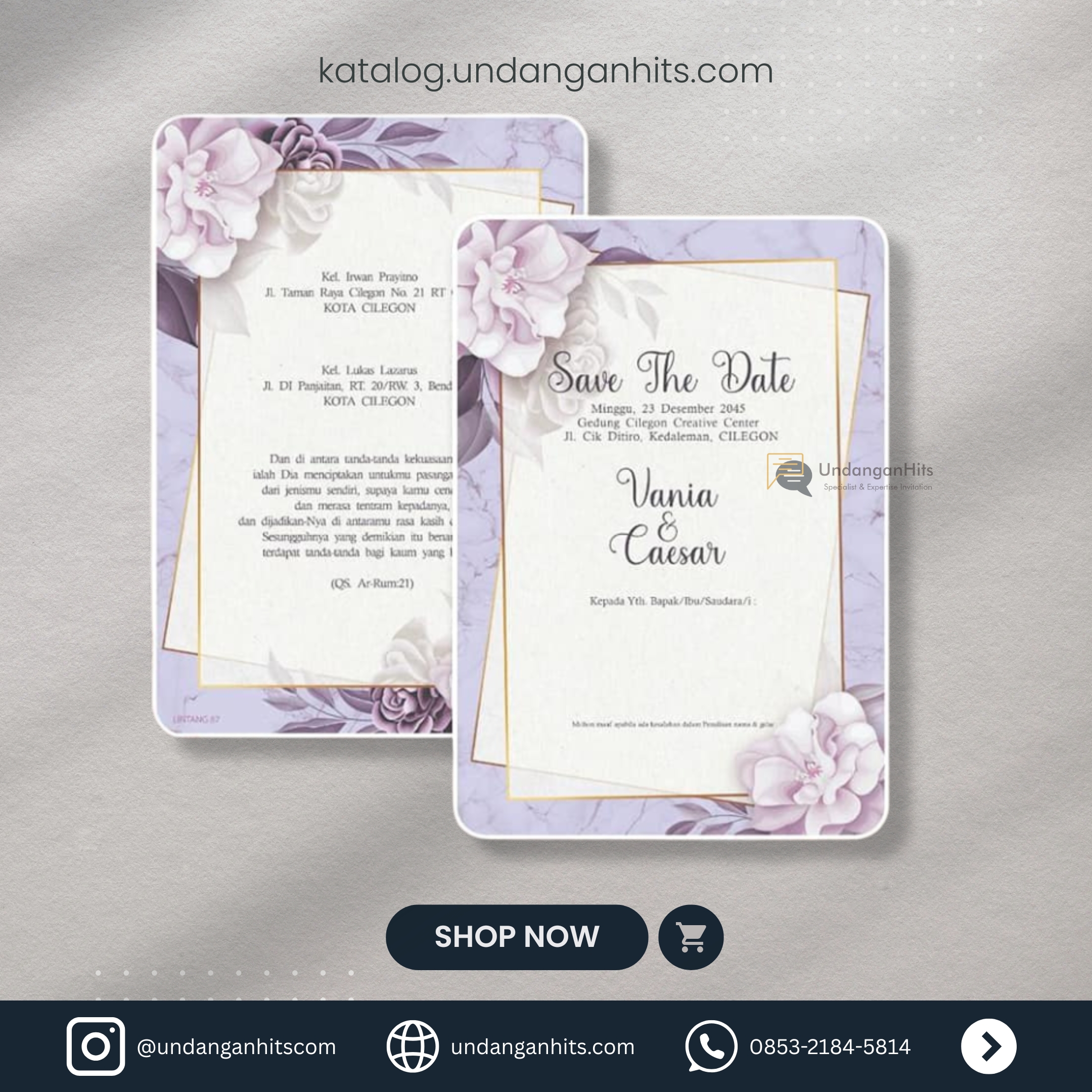 Undangan ini memancarkan keanggunan dengan kombinasi warna ungu lembut dan detail emas, dihiasi oleh bunga mawar yang menawan.