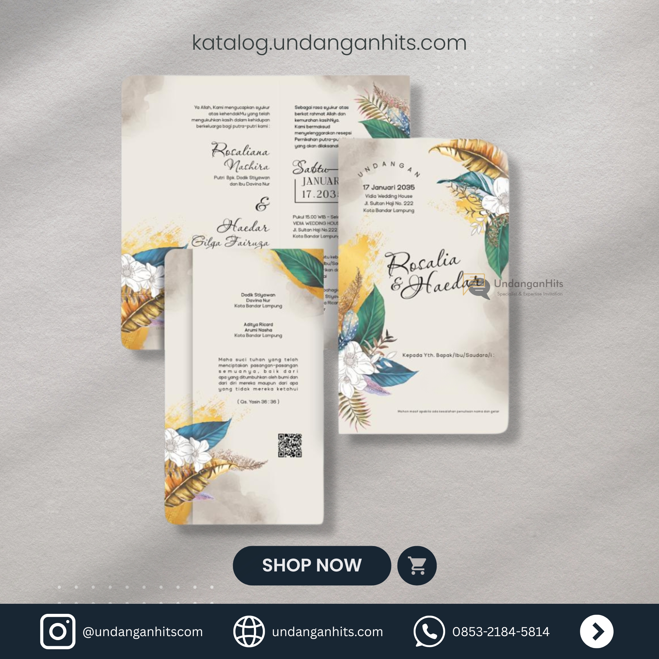 Undangan ini memadukan elemen bunga dan daun dengan sentuhan modern, menciptakan nuansa yang fresh dan elegan. Desainnya yang minimalis menjadikan undangan ini sempurna untuk acara yang berkesan.