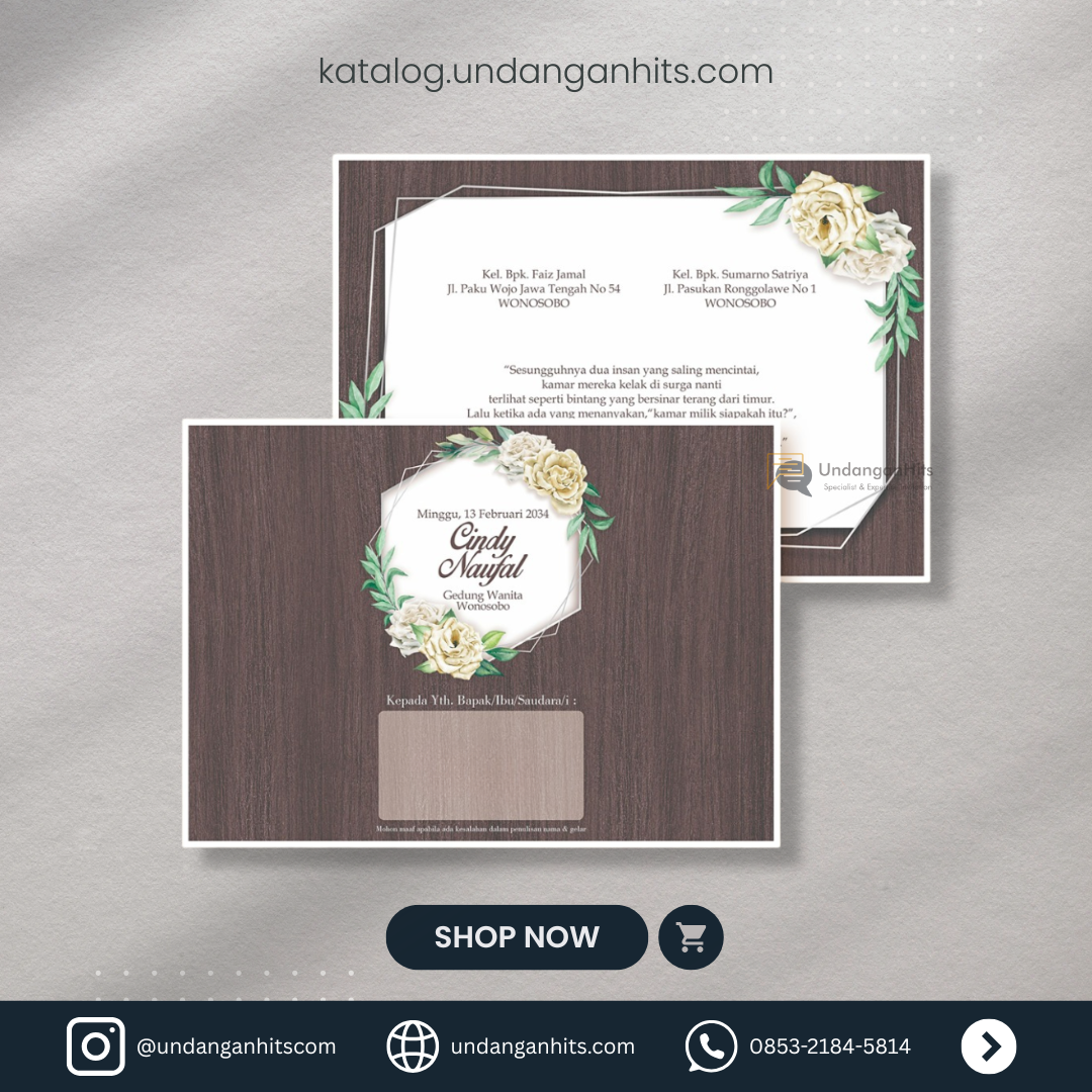 Undangan ini memadukan keindahan floral dengan sentuhan rustic, menciptakan suasana yang hangat dan alami. Kesan elegan berpadu harmonis dengan desain minimalis.
