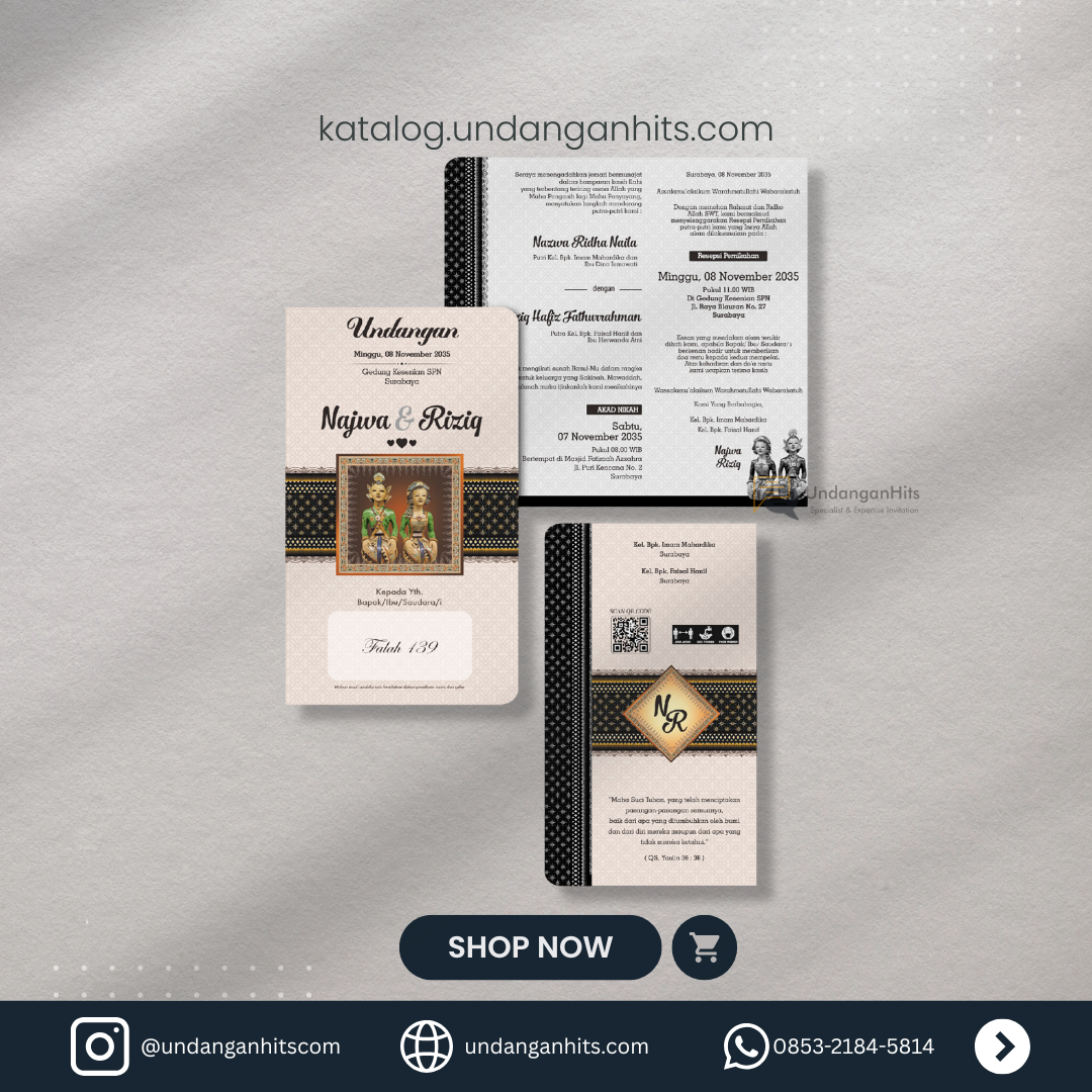 Undangan ini memadukan keanggunan klasik dengan nuansa tradisional Jawa, menjadikannya pilihan yang sempurna untuk perayaan istimewa. Desainnya menggabungkan elemen batik yang kaya dan ornamen elegan, menciptakan kesan yang memikat.