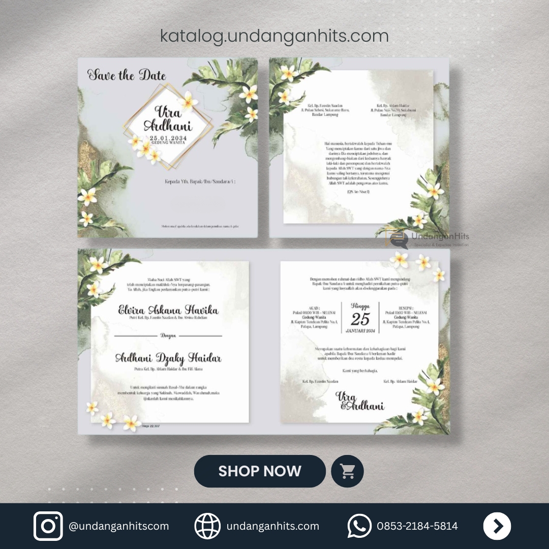 Undangan ini menyuguhkan kesan segar dan alami dengan sentuhan bunga melati yang elegan, sangat cocok untuk pernikahan bertema tradisional. Kombinasi warna hijau dan putihnya menciptakan suasana yang harmonis dan menawan.
