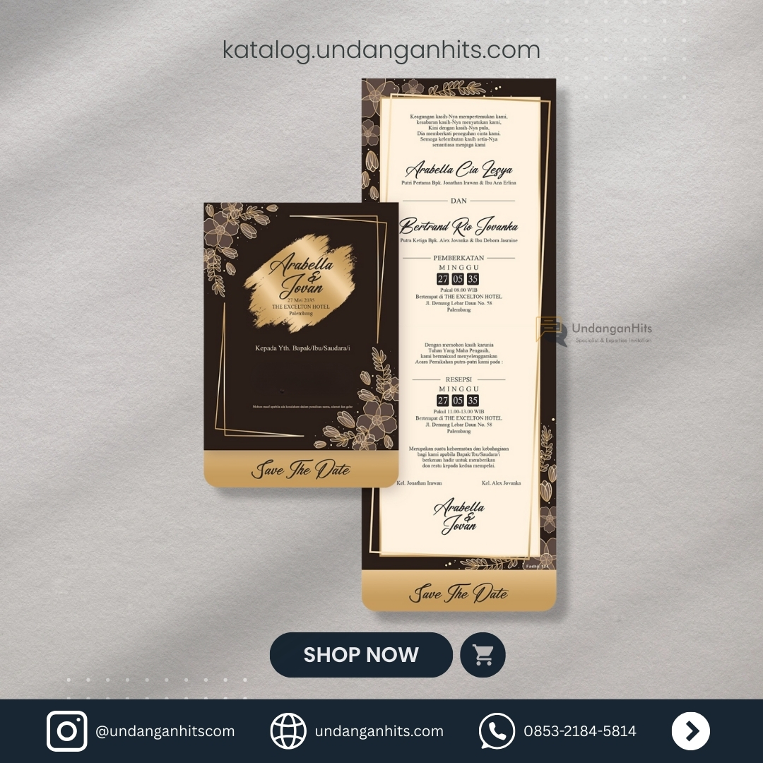 Undangan ini memancarkan kemewahan dengan perpaduan warna emas dan hitam, dihiasi ornamen floral elegan yang menambah kesan formal dan klasik.