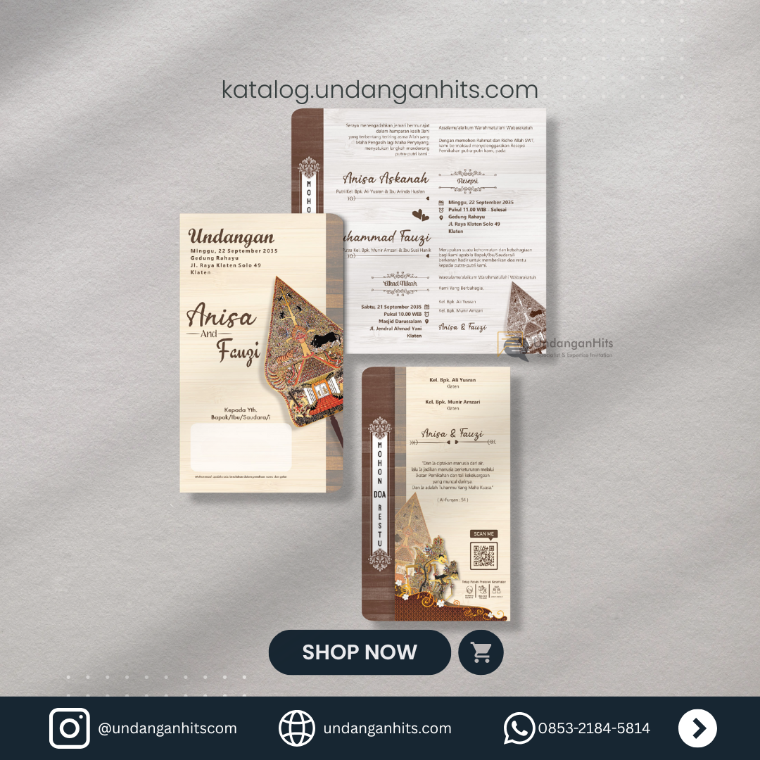 Undangan ini menggabungkan kesan klasik dan tradisional Jawa dengan ornamen batik yang elegan, menciptakan nuansa yang hangat dan bersahaja untuk momen spesial Anda.