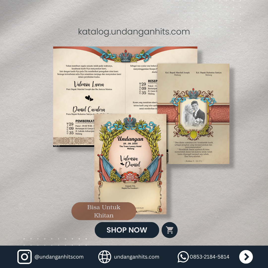 Undangan ini menggabungkan keanggunan klasik dengan ornamen tradisional yang kaya, memberikan kesan formal yang elegan untuk acara spesial Anda.