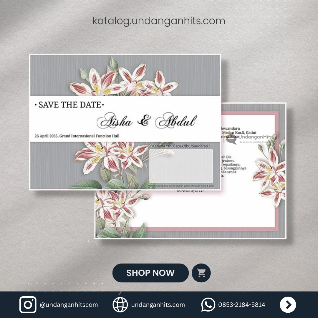 Undangan ini menonjolkan keindahan bunga lily dengan desain elegan yang memancarkan kesan alami dan modern, cocok untuk pernikahan yang berkelas.