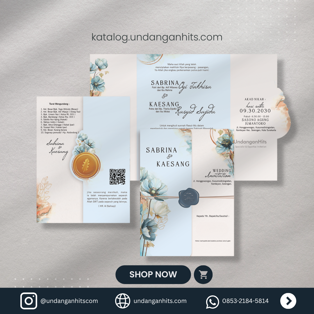 Undangan ini menampilkan keindahan bunga watercolor dengan palet warna biru lembut, menciptakan kesan segar dan elegan. Detail cap lilin menambah sentuhan klasik yang menawan.