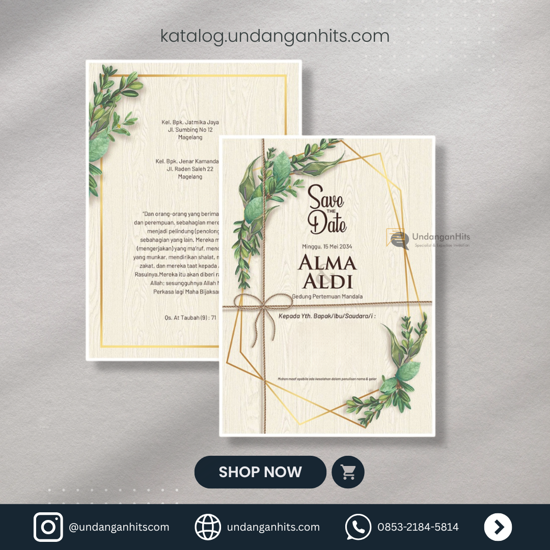 Undangan dengan sentuhan alam, dihiasi daun hijau yang segar dan nuansa kayu yang rustic, sempurna untuk pernikahan yang elegan dan natural.