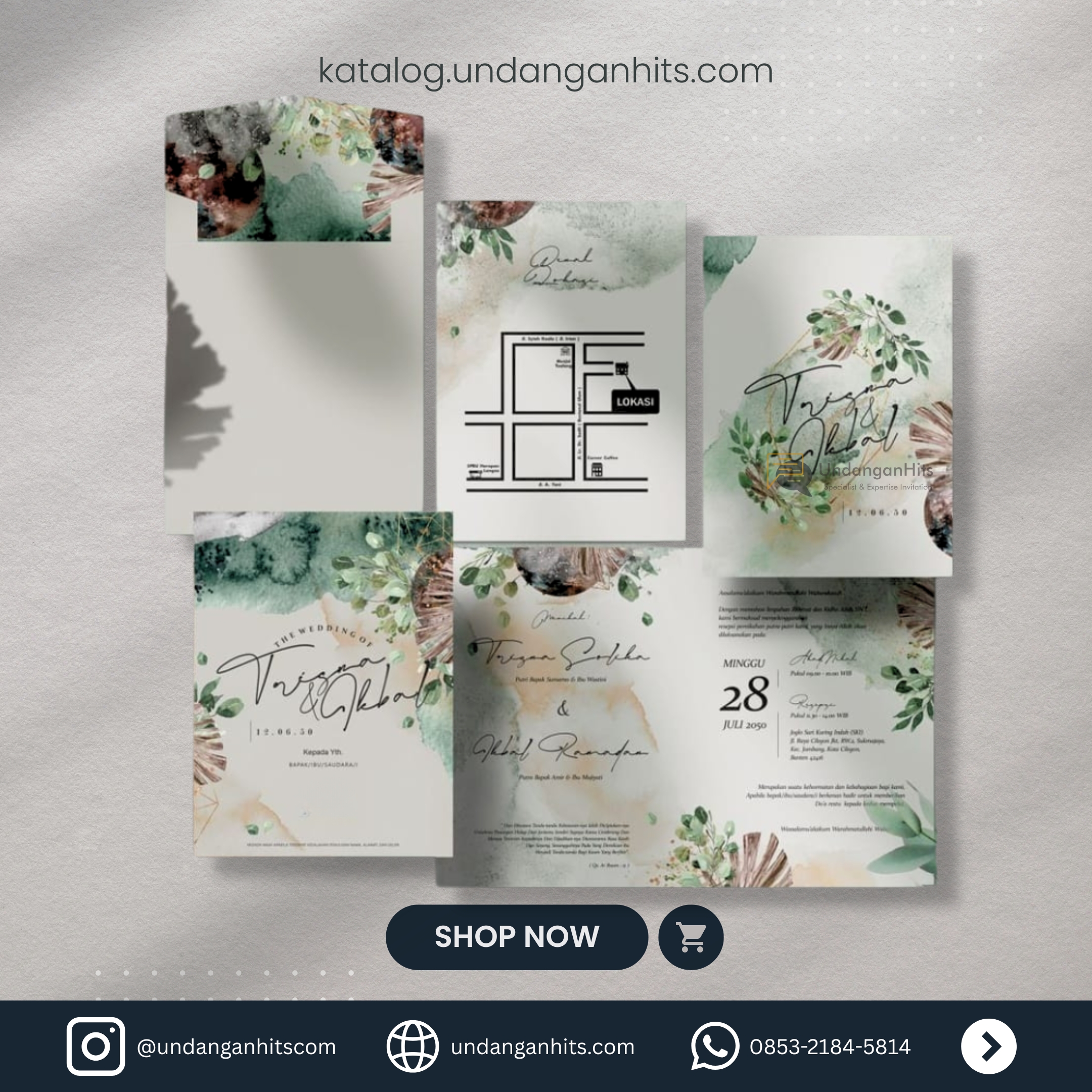 Undangan ini memancarkan nuansa alami dengan ilustrasi daun dan bunga yang elegan, sempurna untuk pernikahan yang mengutamakan keindahan alam.