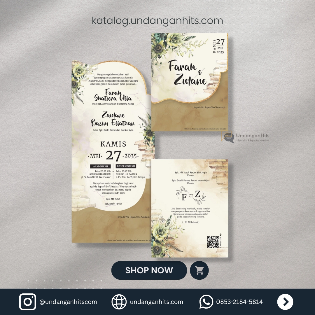 Undangan ini memadukan keanggunan dengan sentuhan botanical, dihiasi dengan bunga dan tanaman hijau yang menawan, menciptakan nuansa yang sekaligus modern dan elegan.