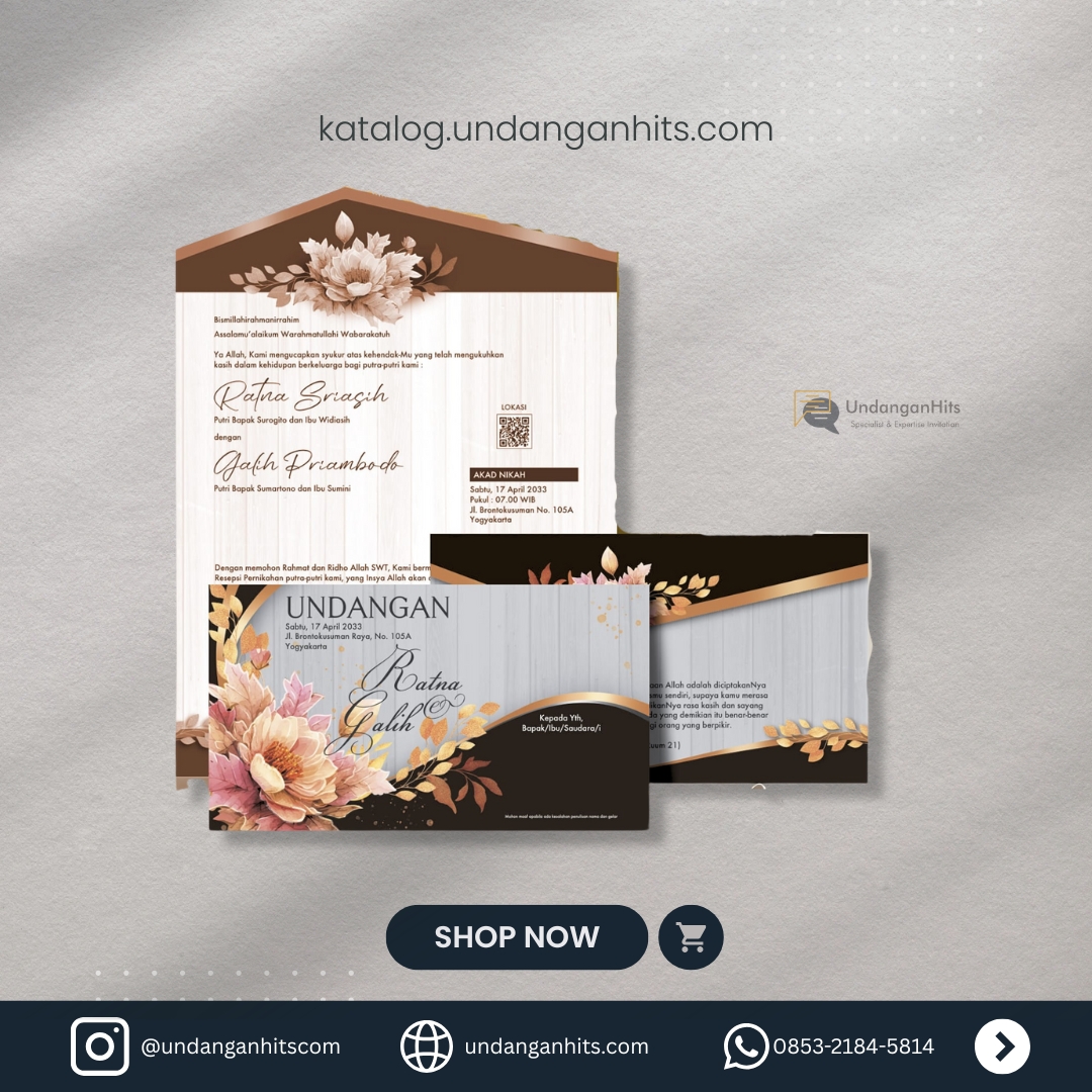 Undangan yang memadukan motif kayu dan bunga peony, memberikan kesan rustic yang hangat dan elegan.